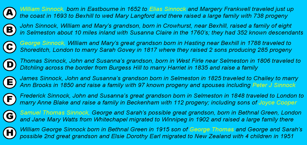 Legend for Map of William Sinnock and Mary Langford's family wanderings from Eastbourne, SussexClick Yellow Names for people links Use your browser's back arrow to return
